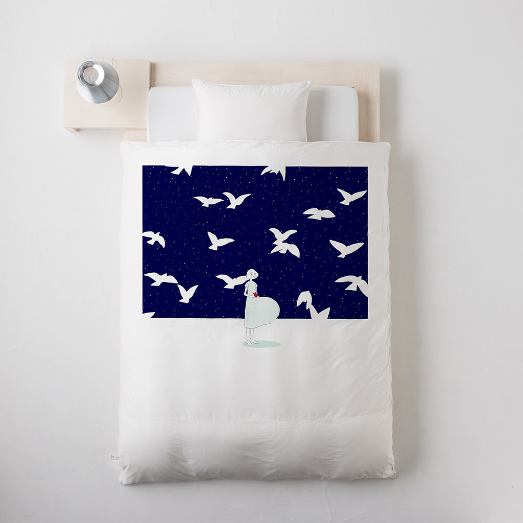 表参道布団店の商品「白く清潔な掛け布団カバー」に高精細プリンターでアーティストの作品をプリントしました。